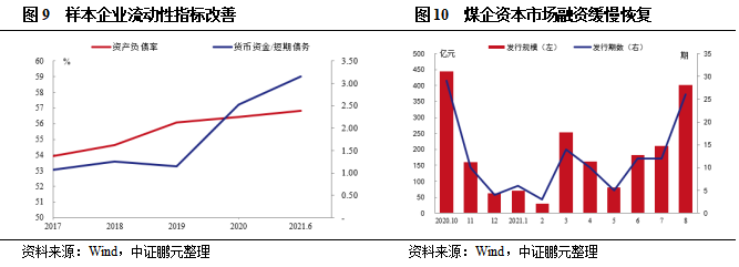 2021年6月末,樣本企業(yè)平均資產(chǎn)負債率為56.81%,明顯低于行業(yè)平均水平(66.14%),較2020年末變動不大,樣本企業(yè)資本結(jié)構仍未得到有效改善。2021年6月末,樣本企業(yè)貨幣資金/短期債務為3.15,較上年末水平上升0.62,樣本企業(yè)流動性指標繼續(xù)邊際改善。此外,2021年8月煤企債券市場共發(fā)行26期債券,融資規(guī)模超過400億元,已接近去年10月份的發(fā)行規(guī)模,行業(yè)融資逐漸回暖。預計隨著煤價繼續(xù)維持高位,樣本企業(yè)盈利將持續(xù)維持較高水平,經(jīng)營活動現(xiàn)金流持續(xù)凈流入,償債壓力邊際改善。