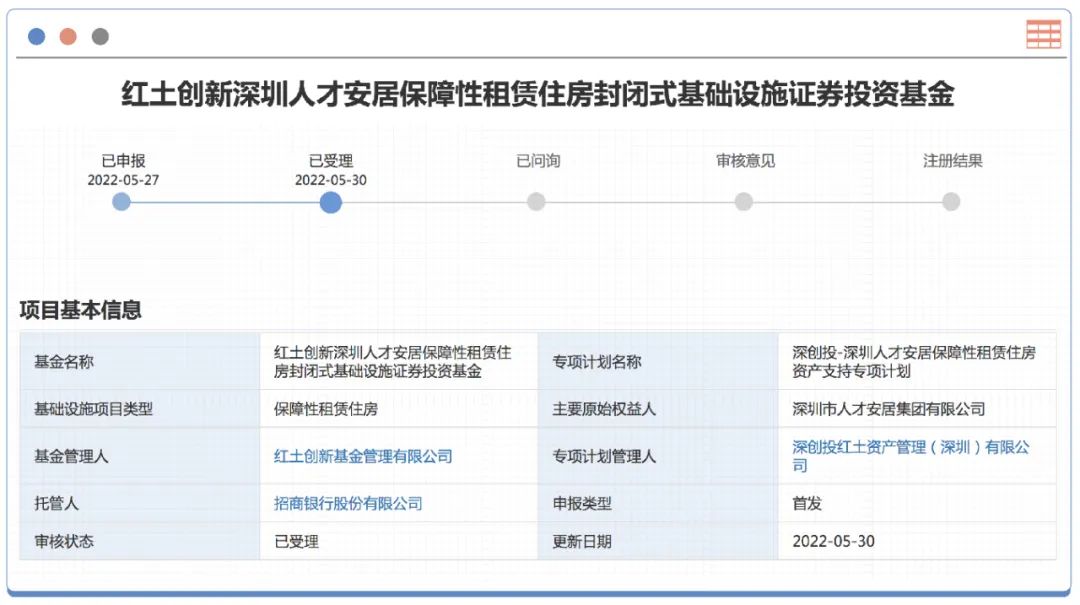 紅土創新深圳人才安居保障性租賃住房封閉式REIT的申報資料顯示,主要原始權益人為深圳市人才安居集團有限公司,專項計劃管理人為深創投紅土資產管理(深圳)有限公司。
