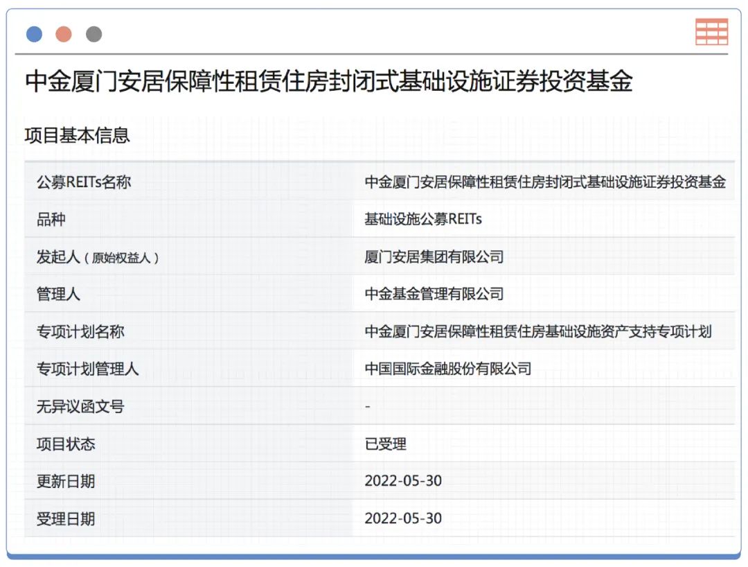 申報資料顯示, 中金廈門安居保障性租賃住房封閉式REIT,對應的專項計劃名稱為中金廈門安居保障性租賃住房基礎設施資產支持專項計劃資產支持證券,發起人(原始權益人)為廈門安居集團有限公司。