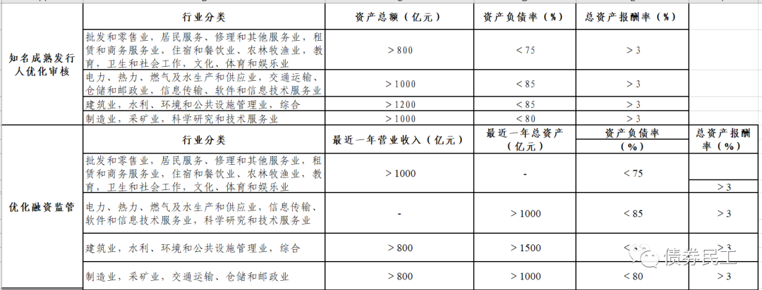 3、《優(yōu)化審核》明確了明確的資產(chǎn)總額、資產(chǎn)負(fù)債率和總資產(chǎn)報(bào)酬率等財(cái)務(wù)指標(biāo)要求,去掉了營(yíng)業(yè)收入指標(biāo)。《優(yōu)化審核》和《優(yōu)化融資監(jiān)管》對(duì)于行業(yè)的設(shè)置是一致的,但是對(duì)于財(cái)務(wù)指標(biāo)是不一致的,同時(shí)對(duì)于不同行業(yè)的財(cái)務(wù)指標(biāo)也進(jìn)行了一定的調(diào)整。
