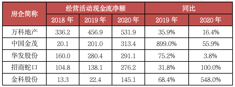 具體來看,27家房企連續三年經營活動現金流均保持凈流入的房企資金鏈較為穩定,抵御流動性風險能力較強,同時降杠桿目標也更易達成。其中萬科、金茂、華發、招商蛇口和金科股份在此基礎上,2019-2020年經營活動現金流凈額保持正增長。