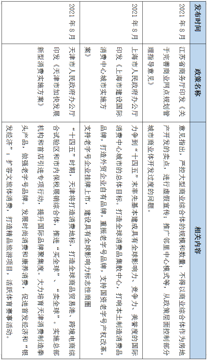 2021年出臺的相關商業政策,主要涉及城市商業發展、商圈改造升級、夜經濟發展等方面,給行業的穩健發展營造了健康環境。