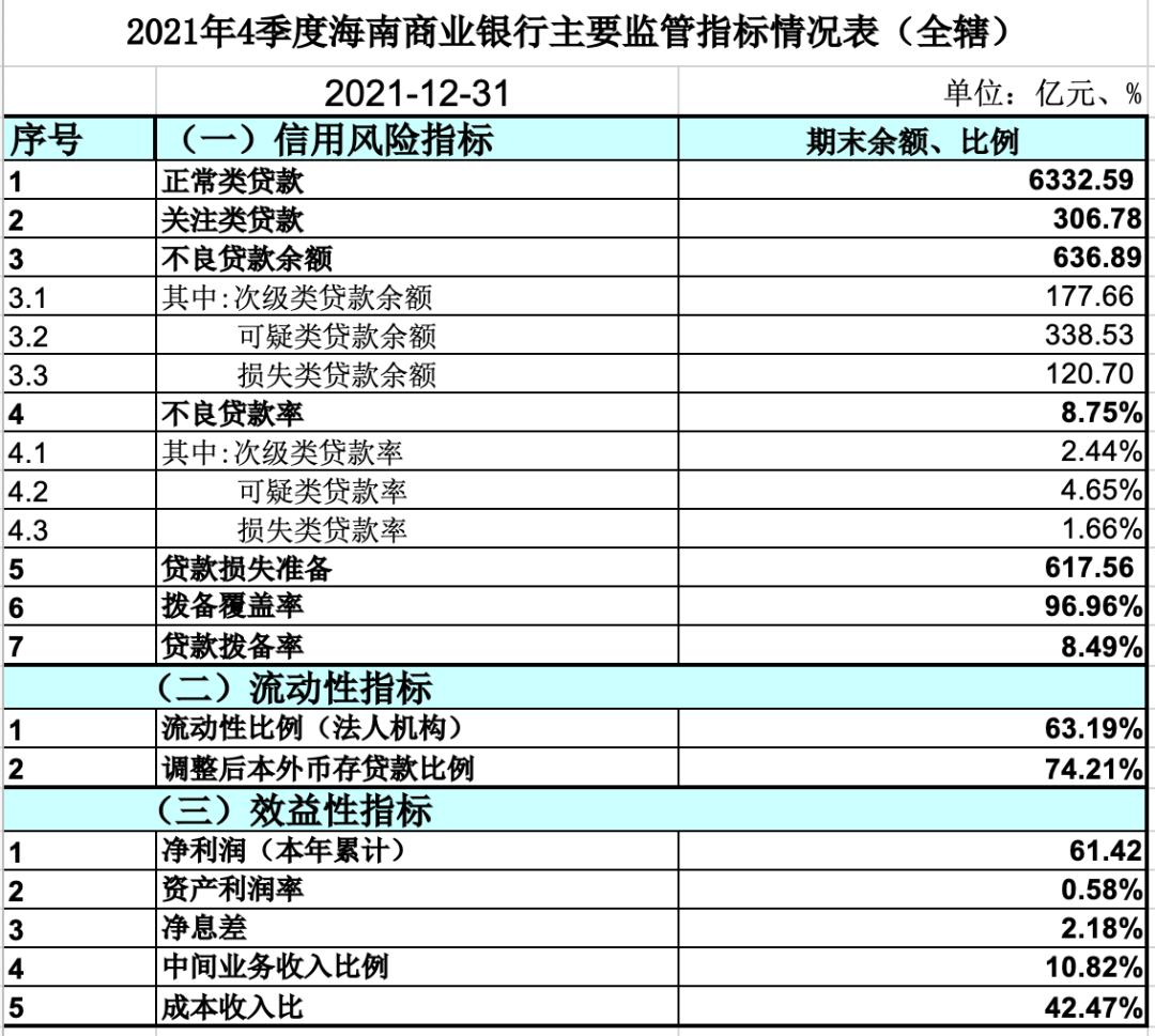 具體到海南,2020年末,海南商業銀行不良貸款余額140.84億元,不良率2.11%,撥備覆蓋率440.71%,整體情況不算差,尤其撥備覆蓋率遠好于行業平均。但到去年末,海南商業銀行不良貸款余額暴增到636.89億元,不良率飆升至8.75%,撥備率掉到了96.96%。