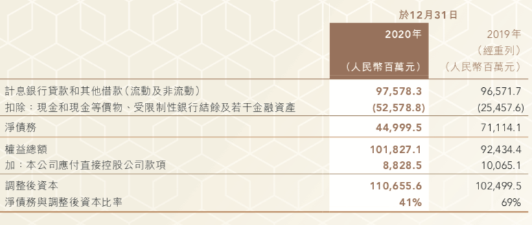這項(xiàng)數(shù)據(jù)的計(jì)算公式為“計(jì)息銀行貸款及其他借款”扣除貨幣資金、若干金融資產(chǎn),再除以權(quán)益總額加應(yīng)付直接控股公司款項(xiàng)。