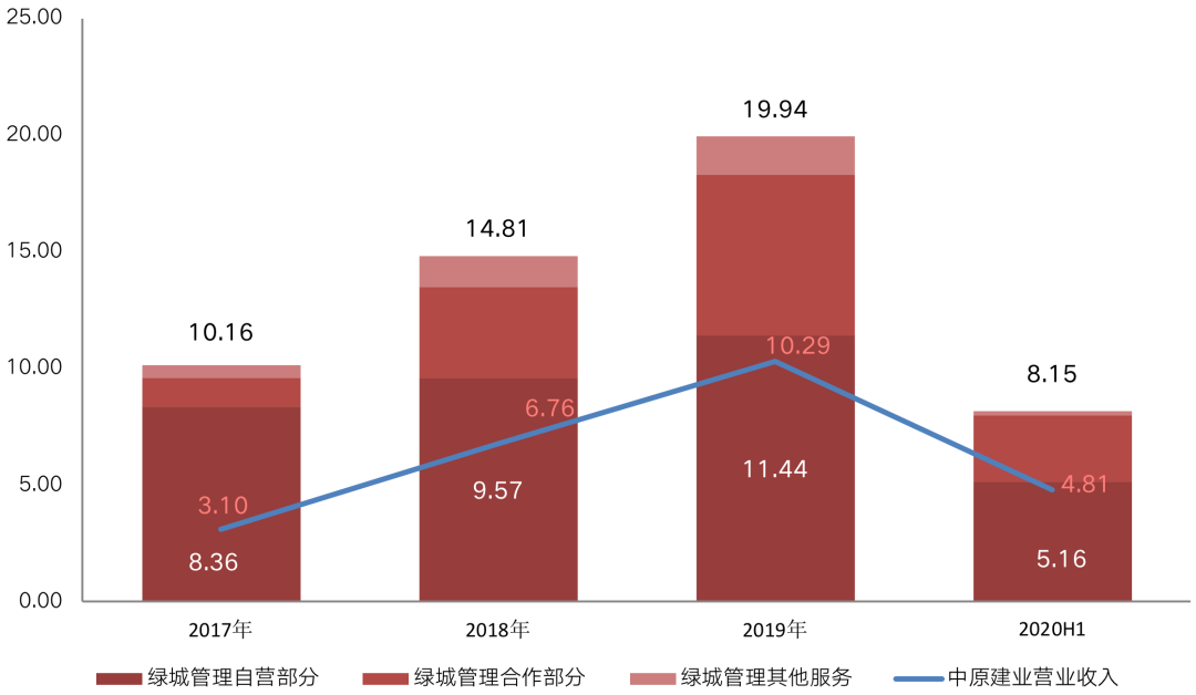 圖:歷年綠城管理及中原建業(yè)營(yíng)業(yè)收入及結(jié)構(gòu)(億元)