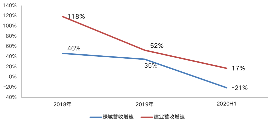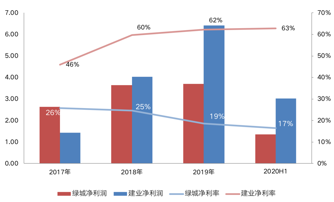 從營(yíng)收的增速來(lái)看,中原建業(yè)的增長(zhǎng)速度更快。2018年、2019年及2020上半年的營(yíng)收增速分別為118%、52%、17%,高于綠城管理。但值得注意的是,不論是綠城還是建業(yè),近年來(lái)其營(yíng)收增速均出現(xiàn)了不同程度的下降。營(yíng)收規(guī)模的增長(zhǎng)依賴(lài)代建業(yè)務(wù)的擴(kuò)張,未來(lái)若市場(chǎng)對(duì)代建需求發(fā)生改變,或其他房地產(chǎn)代建公司加入導(dǎo)致競(jìng)爭(zhēng)加大,綠城及建業(yè)或?qū)o(wú)法保持以往高速的營(yíng)收增速。