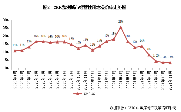 整體來看,11月的土地市場延續(xù)了低溫態(tài)勢(shì),深圳、南京、蘇州和無錫等城市第三輪土拍熱度均不敵二輪,22城之外的集中供地城市新一輪集中土拍熱度也持續(xù)下滑,導(dǎo)致本月溢價(jià)率再度走低,僅為3.2%。