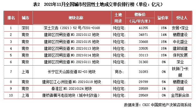 2021年11月處于二、三輪集中土拍的交接期,月內(nèi)共有深圳、無錫等6個(gè)重點(diǎn)城市拍地。