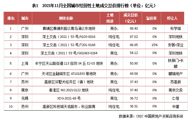 11月,正值二輪土拍收官、三輪土拍開始之際,寧波、鄭州完成了第二輪集中土拍,深圳、南京、蘇州和無錫等4個(gè)城市年末最后一輪集中土拍也順利收官。因此,本月成交總價(jià)TOP10地塊也來自這些重點(diǎn)城市。其中,摘得總價(jià)榜榜首的地塊為廣州黃埔老城區(qū)一宗商辦地塊,成交總價(jià)為88.4億元,由科學(xué)城競得;門檻地塊則來自蘇州,由中建以36.31億元的底價(jià)競得。