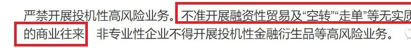 這并不是監(jiān)管及機(jī)構(gòu)第一次關(guān)注供應(yīng)鏈金融和商品貿(mào)易業(yè)務(wù)。2022年2月22日,石家莊市政府國(guó)資委印發(fā)《市國(guó)資委監(jiān)管企業(yè)投資經(jīng)營(yíng)“十個(gè)嚴(yán)禁”》,明確提出“不準(zhǔn)開展融資性貿(mào)易及“空轉(zhuǎn)”“走單”等無(wú)實(shí)質(zhì)性貿(mào)易業(yè)務(wù)的商業(yè)往來(lái)”。