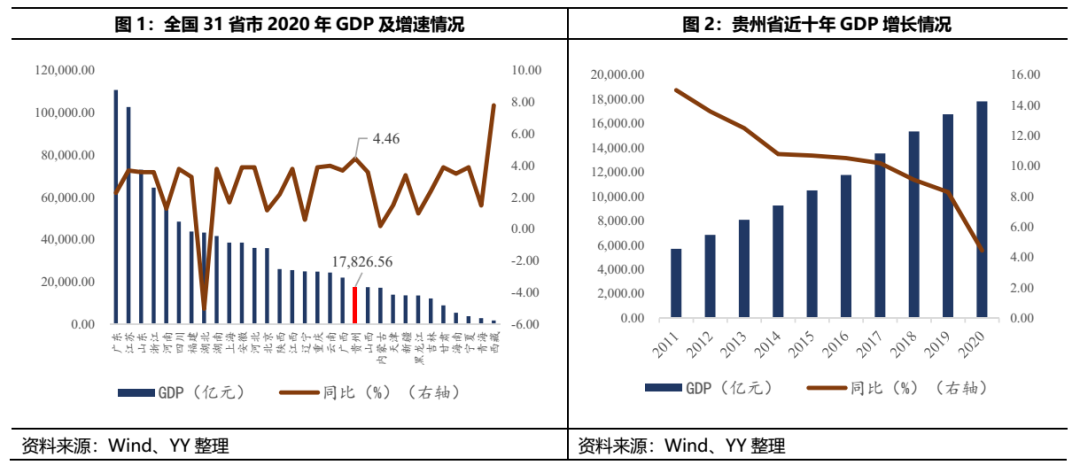 貴州地處我國西南腹地,北接川渝,東毗湖南、南鄰廣西、西連云南,截至2020年末,全省公路通車里程20.67萬公里,實現了“縣縣通高速”,全年全省鐵路、公路、水運貨物運輸總量86,444.63萬噸、旅客運輸總量40,136.73萬人,民航旅客吞吐量2,253.16萬人次,是我國西南地區交通樞紐。貴州地貌素有“八山一水一分田”之說,全省面積中92.5%為山地及丘陵,這也是造成歷史上貴州經濟發展緩慢的原因之一。不過貴州自然資源稟賦強,汞、磷、鋁土礦、煤炭等礦產資源、水資源以及生物資源儲量豐富。目前貴州省轄6個地級市、3個自治州,2019年末常住人口3,622.95萬人,城鎮常住人口占49.02%,戶籍人口4,571.45萬人,城鎮化進程相對滯后且人口流出嚴重。