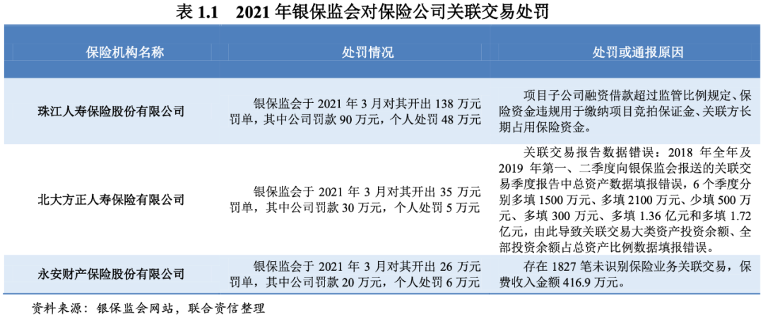 近年來(lái),保險(xiǎn)機(jī)構(gòu)資金運(yùn)用關(guān)聯(lián)交易違規(guī)事件時(shí)有發(fā)生,且隱蔽性及復(fù)雜性均有所加劇,2021年以來(lái),銀保監(jiān)會(huì)持續(xù)加強(qiáng)保險(xiǎn)機(jī)構(gòu)關(guān)聯(lián)交易監(jiān)管工作,并對(duì)違規(guī)主體進(jìn)行一定的處罰與通報(bào)。2021年,銀保監(jiān)會(huì)網(wǎng)站披露珠江人壽保險(xiǎn)股份有限公司、北大方正人壽保險(xiǎn)有限公司以及永安財(cái)產(chǎn)保險(xiǎn)股份有限公司行政處罰決定書(見表1.1);2022年4月,銀保監(jiān)會(huì)下發(fā)了《關(guān)于銀行保險(xiǎn)機(jī)構(gòu)股權(quán)和關(guān)聯(lián)交易監(jiān)管信息系統(tǒng)數(shù)據(jù)質(zhì)量突出問題的通報(bào)》(以下簡(jiǎn)稱“《通報(bào)》”),《通報(bào)》指出,銀行業(yè)保險(xiǎn)業(yè)關(guān)聯(lián)交易監(jiān)管系統(tǒng)于2020年9月上線運(yùn)行,其中4家保險(xiǎn)機(jī)構(gòu)因數(shù)據(jù)報(bào)送不及時(shí)或數(shù)據(jù)填報(bào)不準(zhǔn)確遭點(diǎn)名。