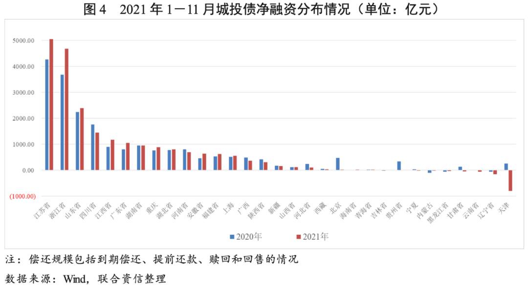 2021年1-11月,城投債償還規模同比擴大,城投債凈融資20813.57億元,較上年同期的20837.49億元基本持平,但凈融資增速同比大幅下降。