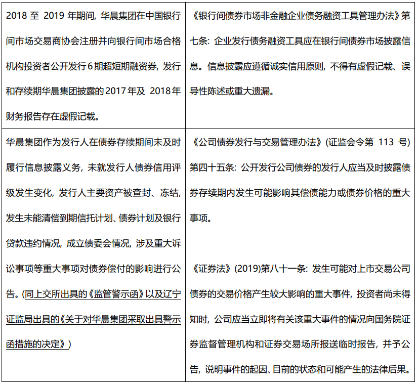 如何建立因果關系是一門學問, 而證監會認為的發行人涉嫌騙取獲得公開發行行政許可批復的違法違規行為直接為投資人確立了一條最為強有力的因果關系。對于發行在2019年8月8日之后的公開發行的19華集01、20華集1債券持有人而言, 其可直接主張“如果發行人如實披露了財務數據, 沒有財務造假, 發行人就無法獲得證監會的行政許可, 也不可能發行19華集01、20華集1債券; 那么投資人不可能買到該兩只債券, 當然不會有損失”。顯然該等因果關系是強于那些在募集說明書中引用虛假財務數據的債券, 例如20華晨01, 該等債券持有人仍需循規蹈矩地討論和論證發行人在募集說明書中的虛假陳述行為是如何影響其對發行人的償債能力的判斷。當然, 虛假陳述行為與損失間的因果關系最弱的, 當屬僅發生在債券受托管理期間的虛假陳述行為了。