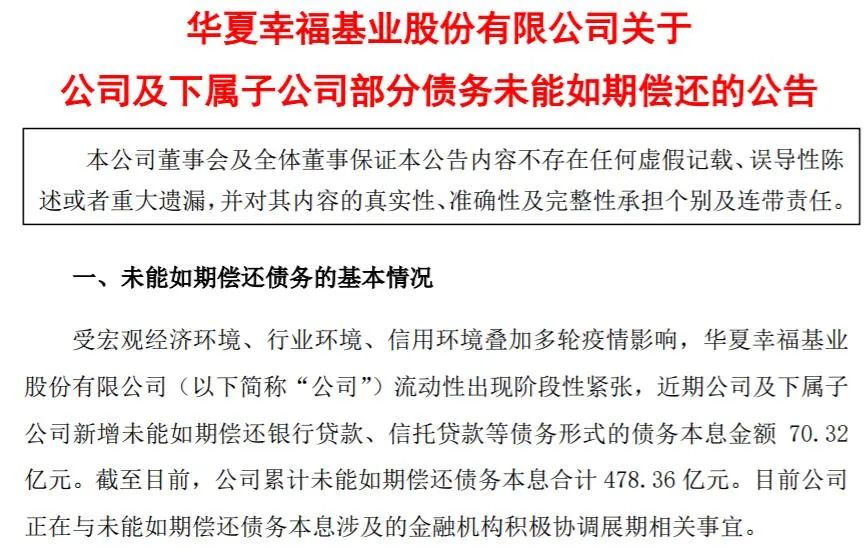 6月11日,華夏幸福基業(yè)股份有限公司公告,近期公司及下屬子公司新增未能如期償還銀行貸款、信托貸款等債務(wù)形式的債務(wù)本息金額67.87億,累計未能如期償還債務(wù)本息合計635.72億元。