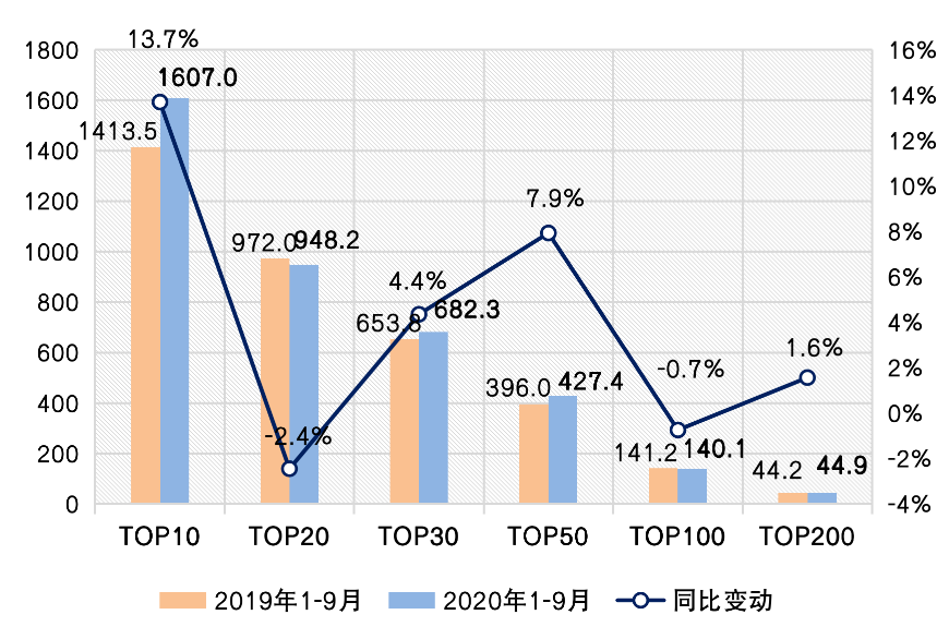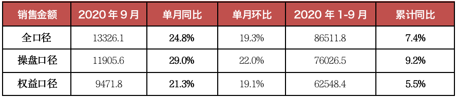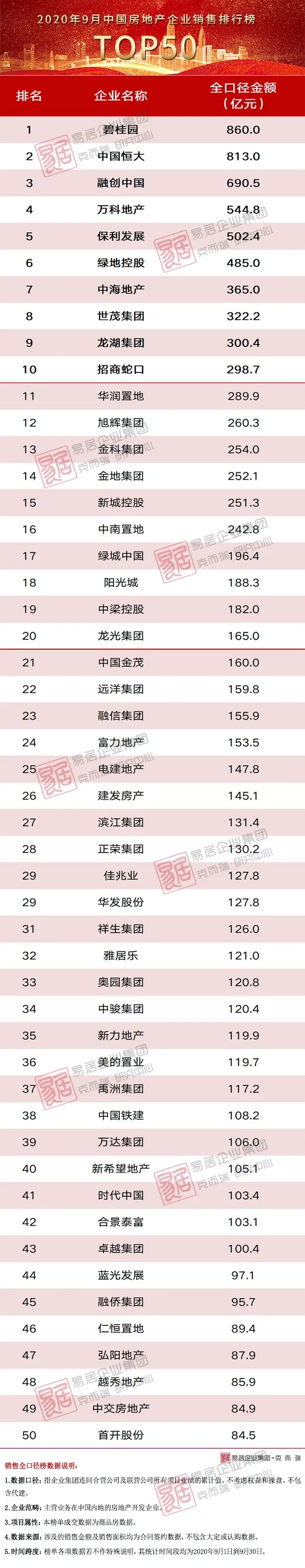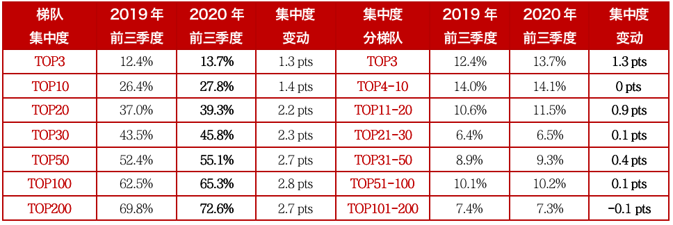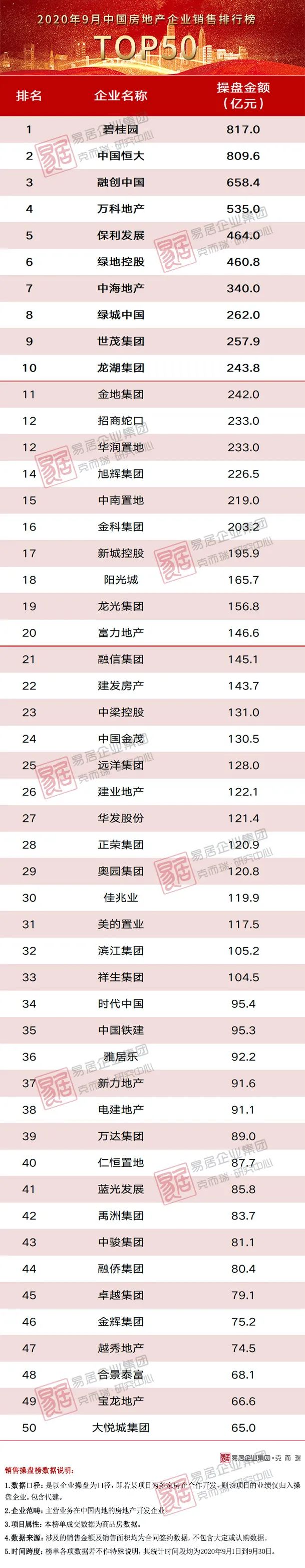 備注:操盤(pán)金額集中度=入榜房企操盤(pán)銷(xiāo)售金額/統(tǒng)計(jì)局公布的全國(guó)商品房銷(xiāo)售金額,其中,2020年前三季度全國(guó)商品房銷(xiāo)售金額是根據(jù)前8月累計(jì)同比增幅推算9月同比增幅所得。