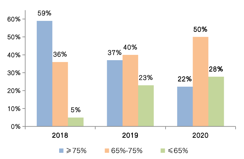 2020年,房企業(yè)績(jī)目標(biāo)的完成情況一定程度上受到疫情影響,整體表現(xiàn)不及2018、2019年同期。