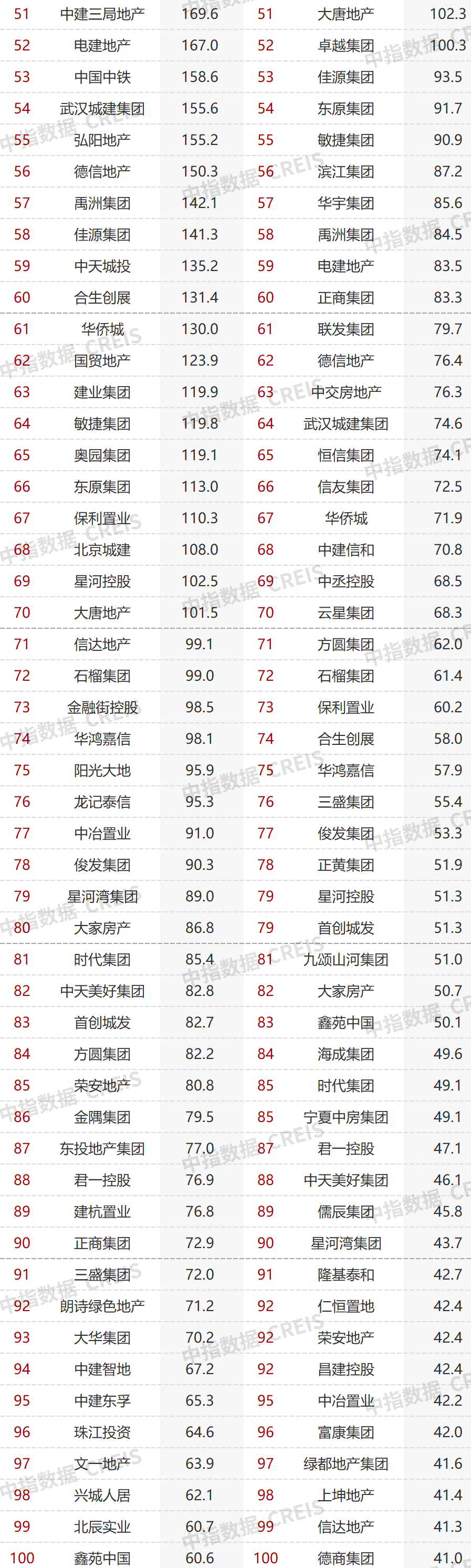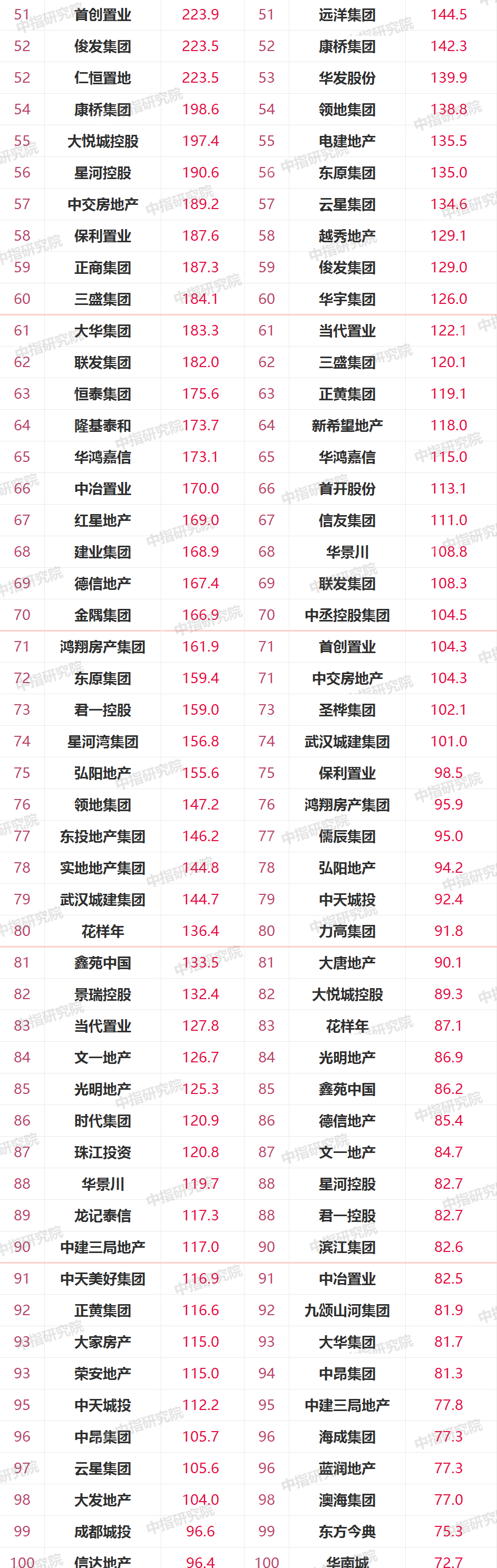 3)51-100位,俊發(fā)集團(tuán)、華鴻嘉信、三盛集團(tuán)、大華集團(tuán)、大發(fā)地產(chǎn)、正商集團(tuán)等降幅有點(diǎn)大,花樣年、當(dāng)代置業(yè)好像有點(diǎn)放飛自我。仁恒置地略有提升,位次從2021年前5月的53位,殺入前50,剛好50名。聯(lián)發(fā)集團(tuán)也殺入前50,49。中建三局地產(chǎn)也從95提升到51,差點(diǎn)就殺入50。