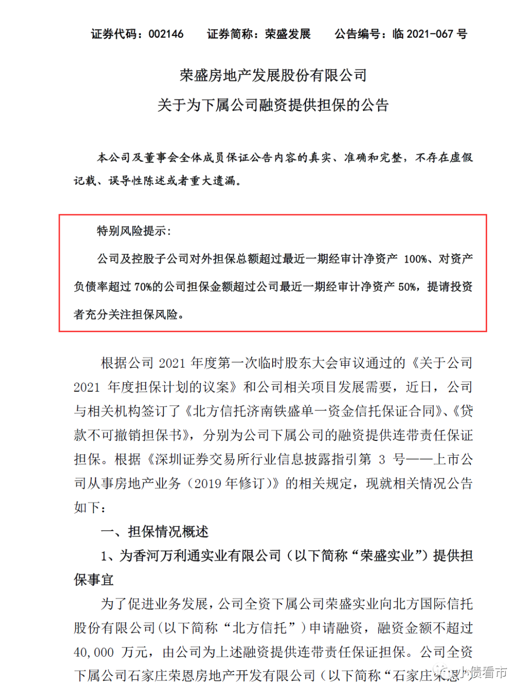 值得注意的是,公告中特別風險提示稱,榮盛發(fā)展及控股子公司對外擔保總額超過其凈資產(chǎn)100%、對資產(chǎn)負債率超過70%的公司擔保金額超過凈資產(chǎn)50%,提請投資者充分關(guān)注擔保風險。