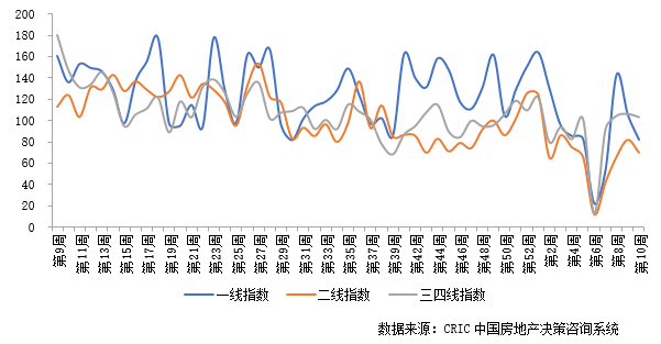 2022年第10周成交整體小幅回落。一線城市成交指數為82.12,環比下降23.46點;二線城市成交指數為69.79,環比下降11.88點;三四線城市成交指數為103.46,環比下降2.96點。