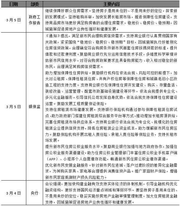 中央層面,政府工作報告提到要支持商品房市場更好滿足購房者的合理住房需求,央行、銀保監會表示優化住房金融服務,緩解新市民住房壓力。