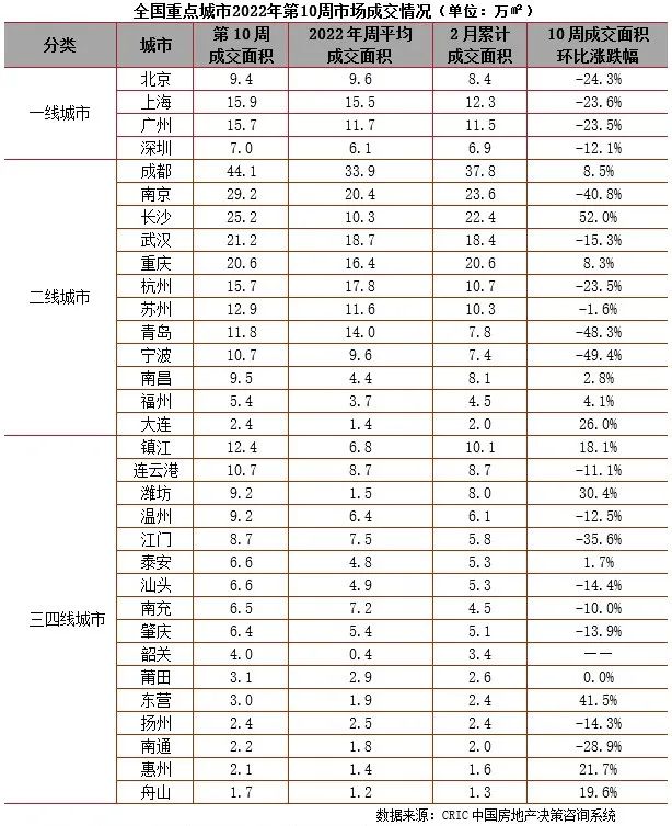 2022年第10周,全國新房供應回升,成交整體回落。供應方面,全國重點城市共取得預售證面積143萬平方米,環比增長47%。成交方面,一線四城成交環比均有所回落,其中,北京、上海、廣州降幅都在20%左右,深圳環比小幅回落,下降12%。二線城市成交環比漲跌參半,成都、長沙成交整體維持較高位水平,而南京成交高位回落,環比下降41%,青島、寧波成交環比近乎腰斬。三四線城市成交環比漲跌參半,連云港、溫州、汕頭環比小幅回落,降幅在10%左右,濰坊、鎮江、東營成交環比回升。