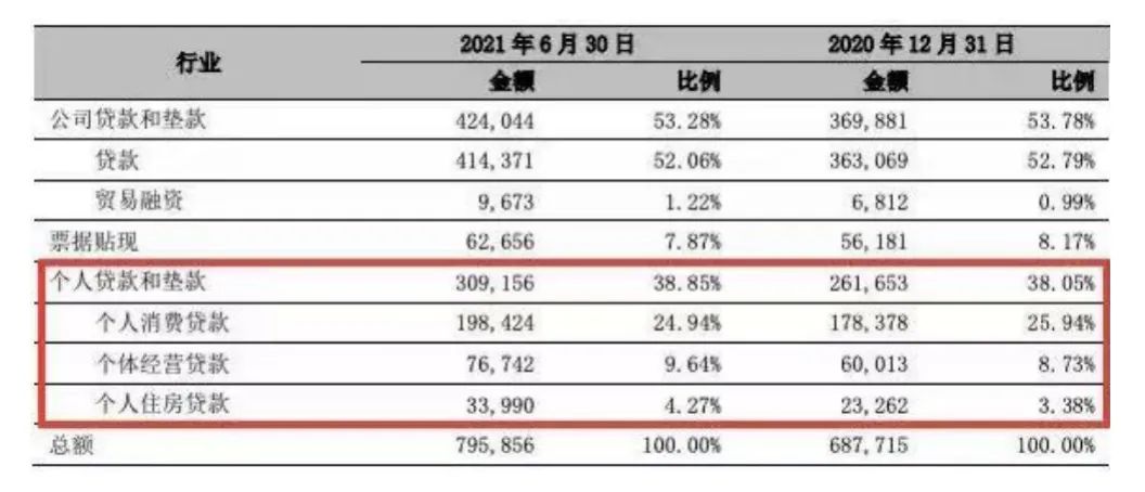 表 1:寧波銀行2021年上半年個人貸款金額與占比情況