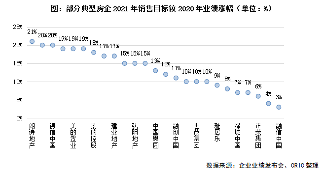 從近30家上市房企在業績發布會披露的2021年銷售目標來看,整體目標增幅有所放緩,近三成上市房企2021年的業績目標預增低于10%,可以看出在杠桿紅利消失后,企業發展以穩健、提質增效為主。