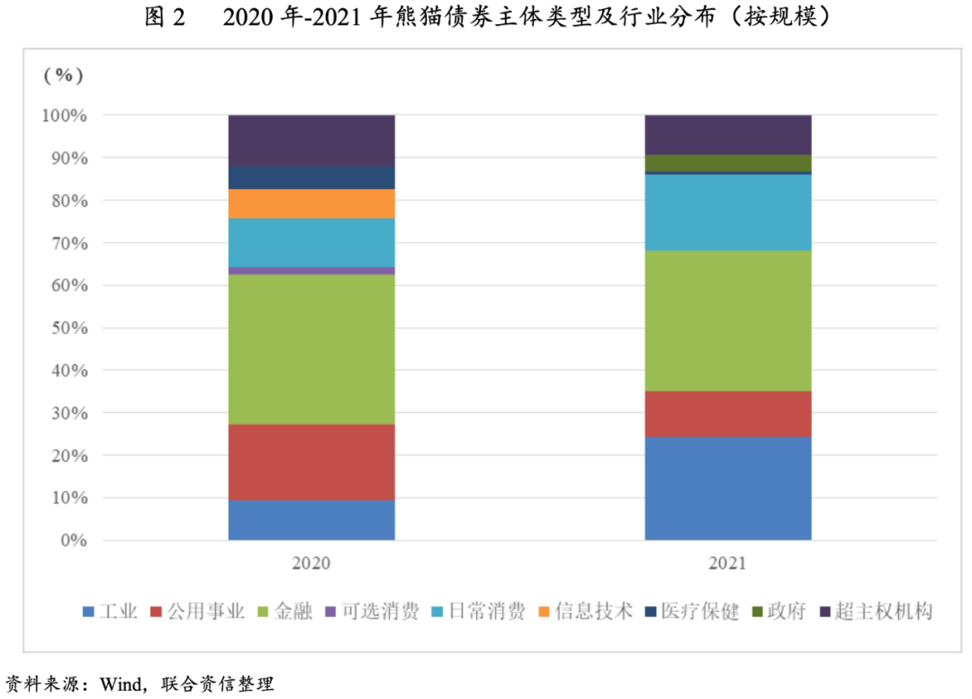 熊貓債券發(fā)行主體主要集中在金融、工業(yè)和日常消費行業(yè),發(fā)行主體類型較上年更加豐富