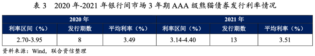選取2020年—2021年在銀行間債券市場發(fā)行且樣本數(shù)量較多的3年期AAA級共計21期熊貓債券樣本進(jìn)行比較,2021年在銀行間債券市場發(fā)行的3年期AAA級債券的平均發(fā)行利率為3.51%,同比小幅上漲0.02個百分點,融資成本整體保持穩(wěn)定。
