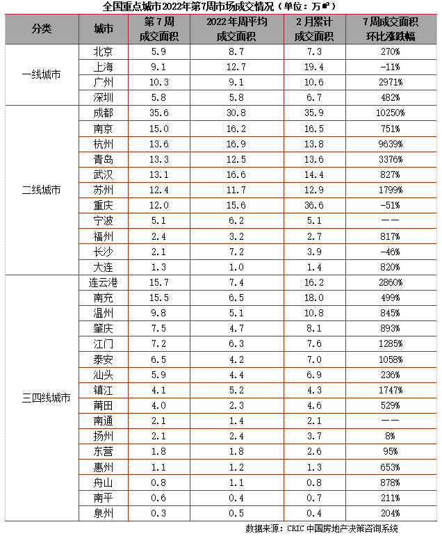 2022年第7周,全國新房供應(yīng)下降,成交回升。供應(yīng)方面,全國重點城市共取得預(yù)售證面積42萬平方米,環(huán)比下降35%。成交方面,受到上周春節(jié)假期低基數(shù)影響,多數(shù)重點城市成交環(huán)比增幅都超過100%,一線城市中,北京、廣州、深圳本周新房成交基本回歸至2022年周平均水平,二線城市中,除重慶、長沙外成交維持低位運(yùn)行以外,其他二線城市成交基本都呈現(xiàn)探底回升走勢,三四線城市中,連云港、南充成交表現(xiàn)亮眼,周成交規(guī)模超過10萬平方米,較2022年周平均翻番,溫州、肇慶、江門等成交觸底反彈。