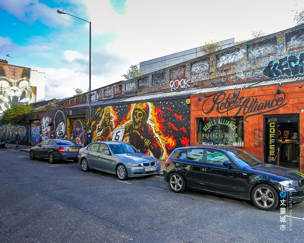 這里也是倫敦最早實(shí)行涂鴉合法化的區(qū)域,來自全球的涂鴉大師在此創(chuàng)作,吸引到年輕人來此打卡。有了人流量,沿街的商鋪逐漸復(fù)蘇。