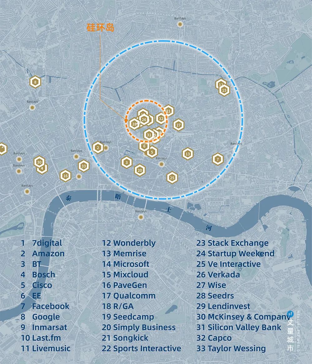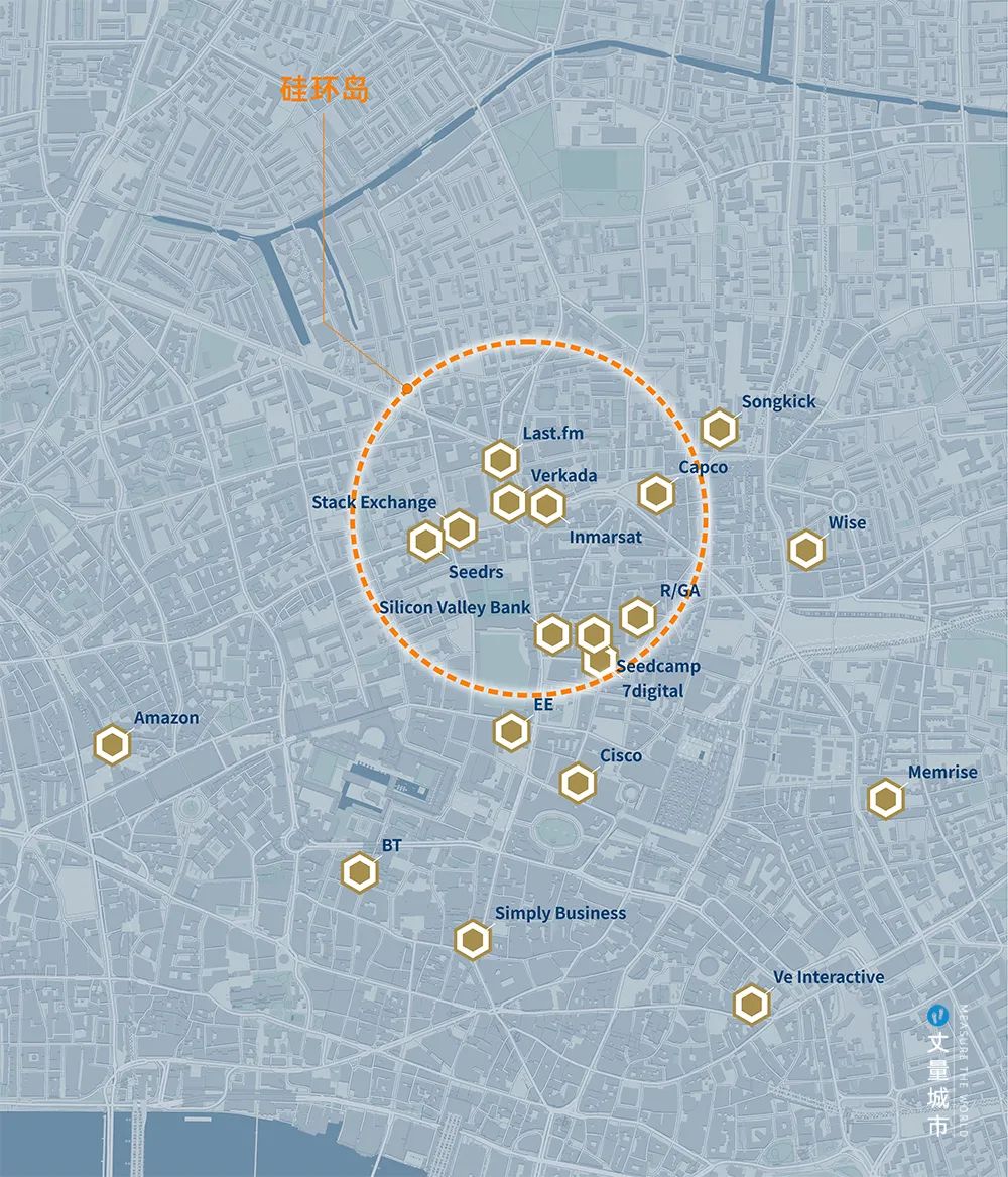 直到1990年代,實(shí)施至今的三輪更新,才扭轉(zhuǎn)區(qū)域的命運(yùn)。如今這里已是英國(guó)科技企業(yè)最密集(已超過1600家)、全球人才密度最高的創(chuàng)新區(qū)。