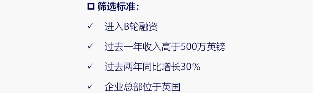 成長(zhǎng)企業(yè):進(jìn)入該階段的企業(yè)會(huì)進(jìn)入「未來五十」計(jì)劃階段,未來五十指:扶持在英國(guó)進(jìn)入B輪融資發(fā)展最快的50家科創(chuàng)企業(yè),英國(guó)政府每年為企業(yè)量身定制扶植計(jì)劃,幫助其發(fā)展。