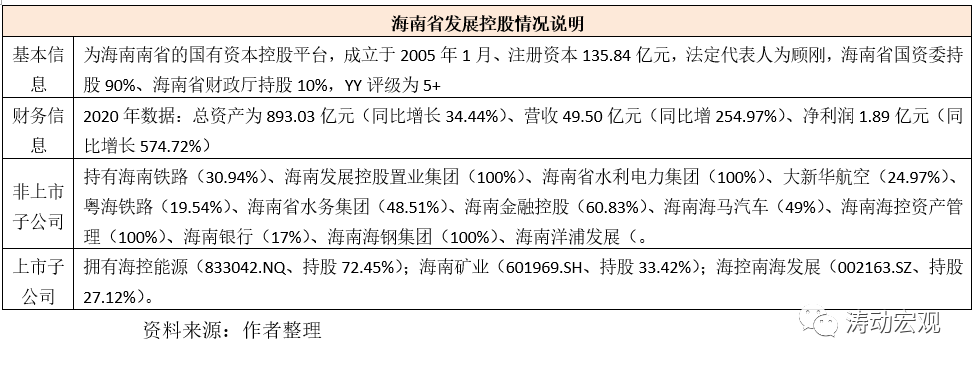 (3)海南省發(fā)展控股成立于2005年1月(注冊資本為135.84億元),法定代表人同樣為顧剛,目前海南省國資委持股90%、海南省財政廳持股10%。海南省發(fā)展控股為海南省的國有綜合性投資控股平臺,旗下?lián)碛泻D系V業(yè)、海控南海發(fā)展以及海控能源等三家上市主體。