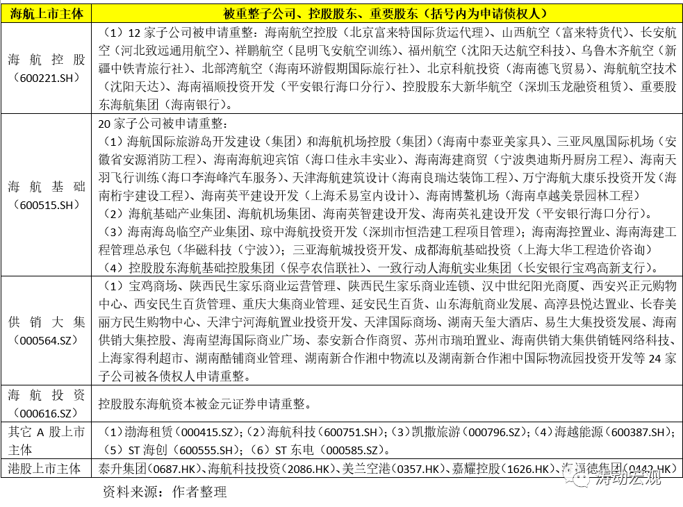 根據(jù)公告信息顯示,向法院申請債務重整的金融機構(gòu)類債權(quán)人主要包括海南銀行、長安銀行(曾經(jīng)被海航系參股)、平安銀行、金元證券、玉龍租賃、中國華融。此次重整還涉及60家左右的子公司,具體看海航控股涉及12家子公司、海航基礎涉及20家子公司、供銷大集涉及24家子公司。