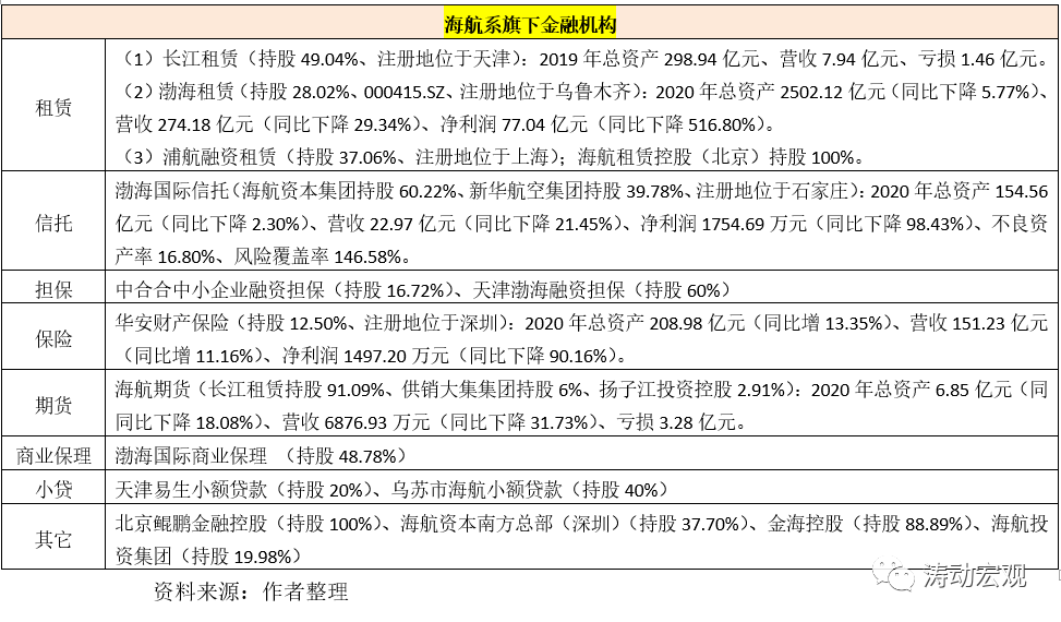 (2)分別擁有渤海租賃(000415.SZ)、海航投資集團(000616.SZ)等兩家上市公司,此外在租賃領域還擁有長江租賃、浦航融資租賃等兩家租賃公司。其中,渤海租賃2020年總資產(chǎn)高達2502.12億元、營收與凈利潤分別達274.18億元和77.04億元,屬于絕對頭部租賃企業(yè)。