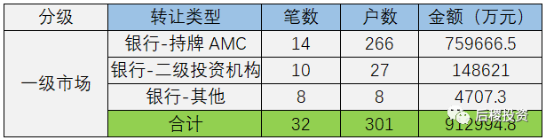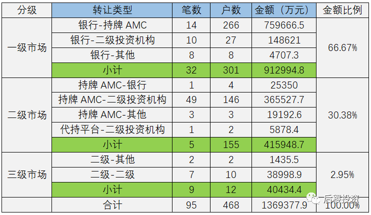根據已有數據顯示,一級市場總成交301戶,總成交金額91億余元,成交規模最大的為銀行-持牌AMC,成交金額占比在一級市場中占83.2%,在全年總成交額中占55.5%。