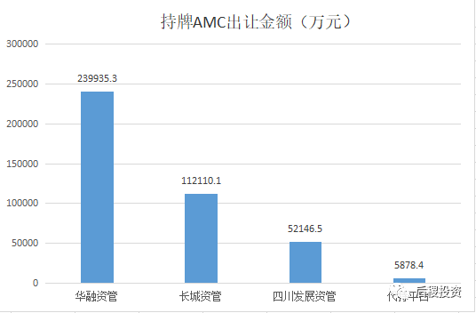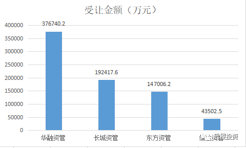 從上圖看,華融資管受讓37.67億元,受讓規模行業第一,長城資管與東方資管受讓金額差距不大,位列二、三名,信達資管受讓金額最少位列第四。
