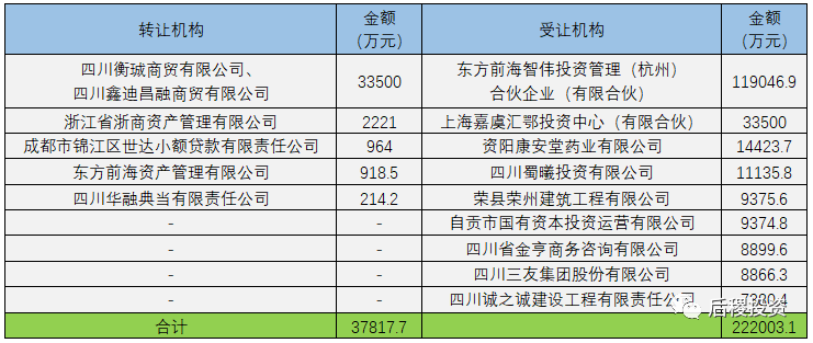 對比上圖數據,華融資管與長城資管均是受讓金額大于出讓金額;未查詢到東方資管、信達資管出讓記錄,未查詢到四川發展資管與代持平臺受讓記錄。
