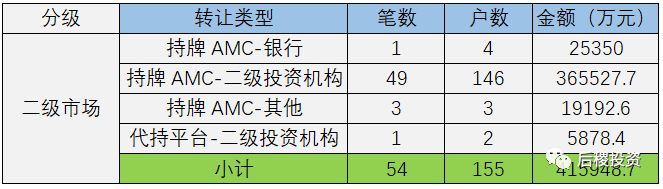 根據已有數據顯示,二級市場總成交155戶,總成交金額41億余元。成交規模最大的是持牌AMC-二級投資機構,成交金額在二級市場中占89%。